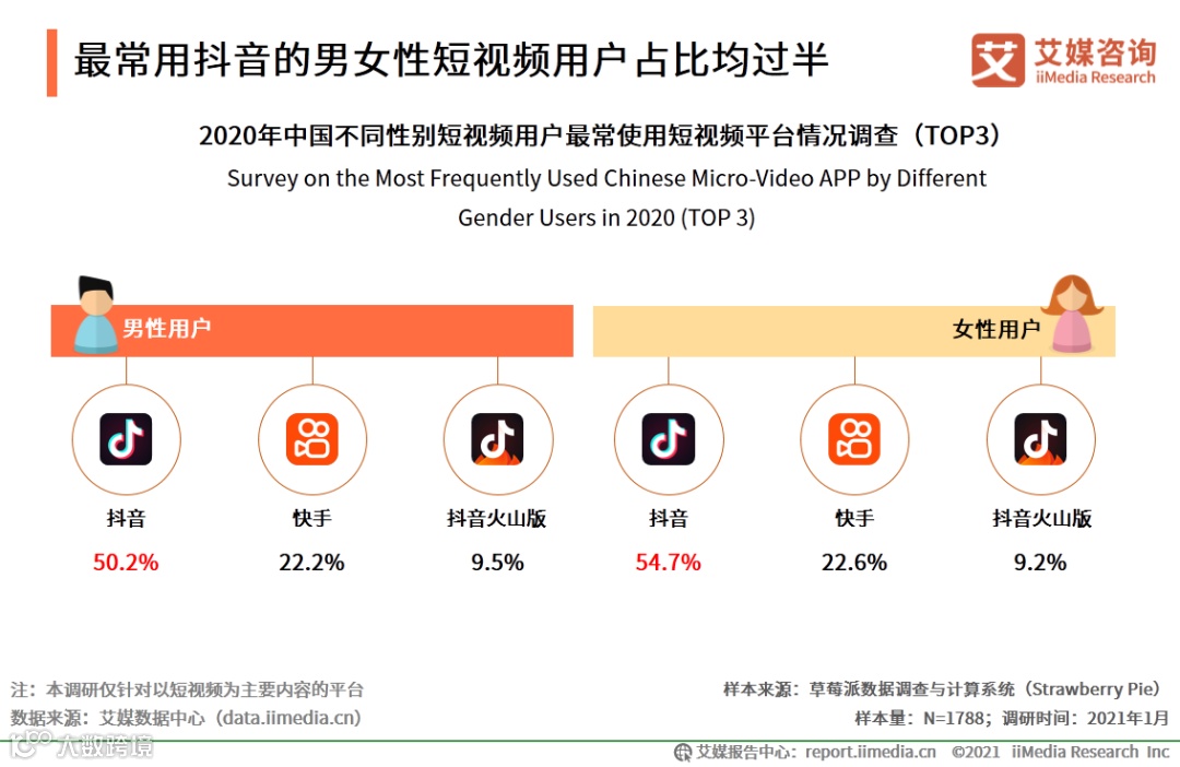 iiMedia Research(艾媒咨询)数据显示,抖音、快手和抖音火山版是受访用户最常使用短视频应用的前三名。其中男性与女性用户最常用产品均为抖音,分别占比50.2%及54.7%。艾媒咨询分析师认为,得益于字节跳动系的生态圈以及抖音的内容质量,抖音拥有巨大的用户接入口,因此抖音成为了短视频用户最常用产品,在各性别人群中均具有忠实用户群体。