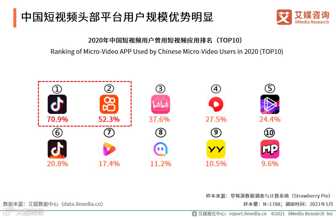 iiMedia Research(艾媒咨询)数据显示,分别有70.9%和52.3%的受访中国短视频用户表示使用过抖音和快手。艾媒咨询分析师认为,抖音及快手在短视频领域头部优势明显,快手发展起步早,用户基础深厚,且积极发展电商和游戏直播等业务,成为头部典型代表;抖音虽然发展时间较短,但追赶势头明显,入驻KOL数量多,带货推广情况良好,也成为用户最多的短视频平台。