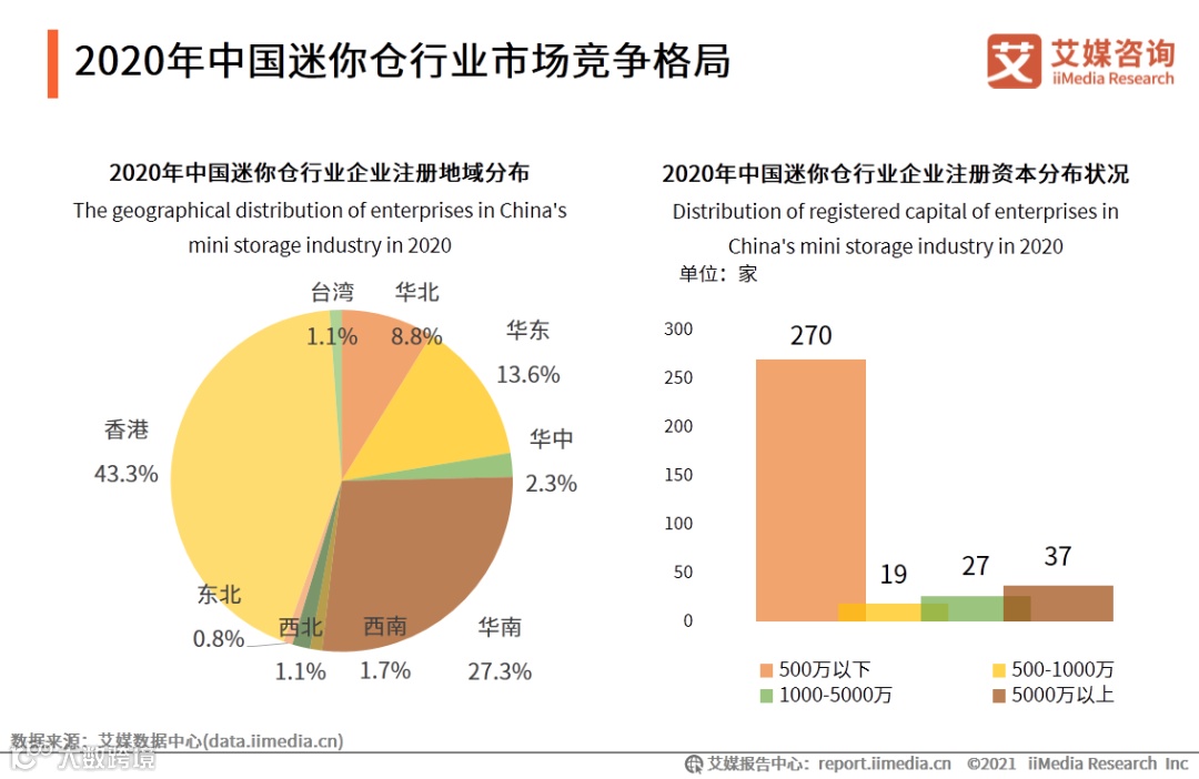 截至2020年11月,中国迷你仓用品企业数量为353家,其中注册资本在500万元以下的迷你仓企业数量最多,共有270家,占迷你仓企业总数的76%。注册资本在5000万以上的企业数量次之,共37家。注册资本在500-1000万的企业数量最少,仅有19家。艾媒咨询分析师认为,迷你仓的经营模式主要是总包分租,只有少数的场地属经营者的自有物业,属于轻资产的经营模式。