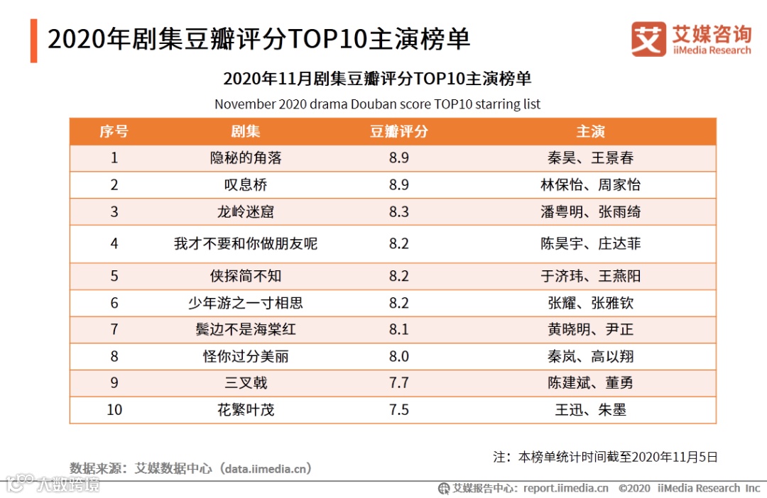 图表8:2020年11月剧集豆瓣评分TOP10主演榜单