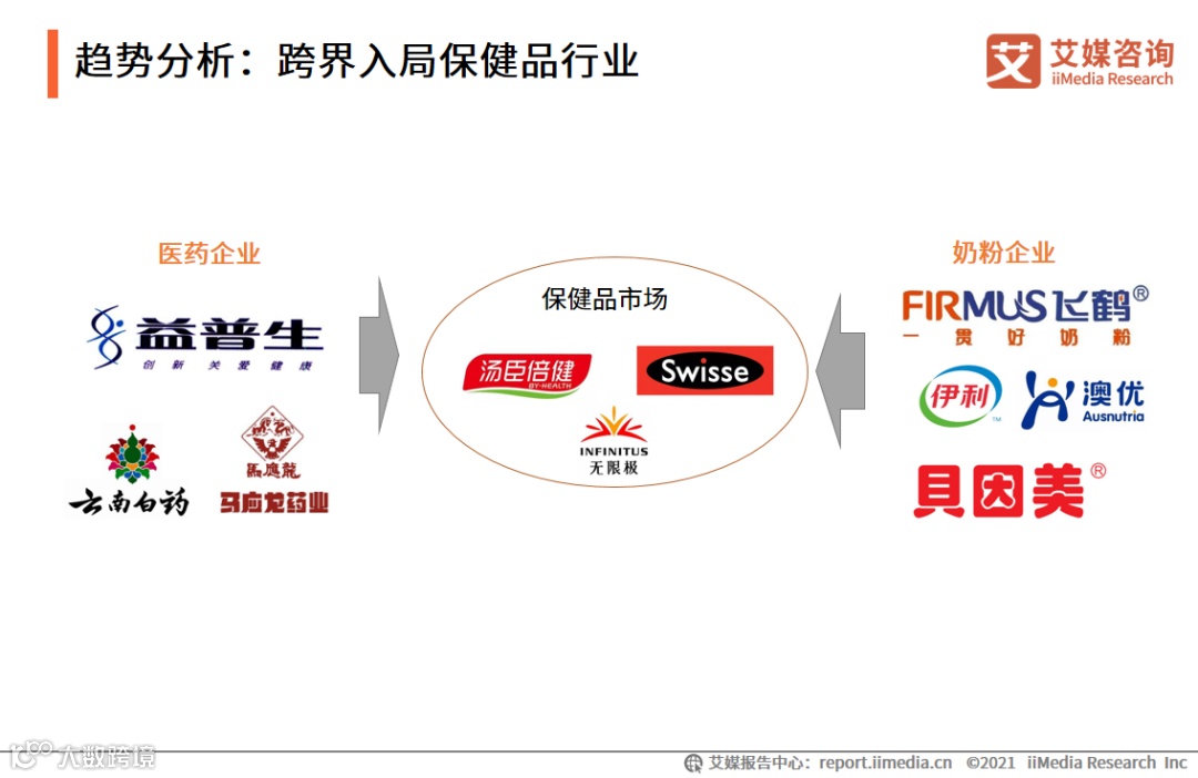 保健品属于大健康领域范畴,领域内其他细分赛道由于竞争激烈,也纷纷开始跨界入局保健品,并作为企业业务增长的新突破口,如医药企业、奶粉企业等。
