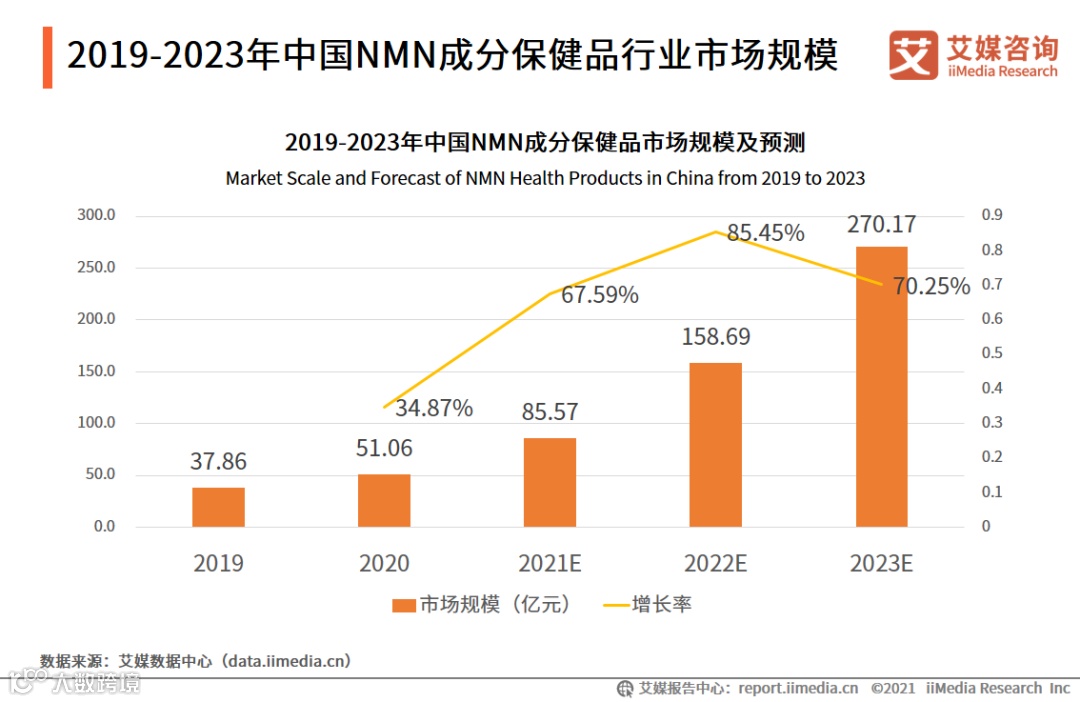 数据显示,2020年中国NMN成分保健品市场规模达51.06亿元,同比增长34.87%,预计到2023年将会以近70.25%的增速攀升至270.13亿元,行业发展速度较快。