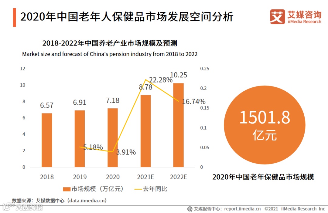 数据显示,2020年中国养老产业市场规模已达到7.18万亿元,预计到2022年将达到10.25亿元,并保持高速增长。保健品行业作为老年群体的刚性需求,作为整个养老产业的重要一环,市场规模已超过1500亿元。