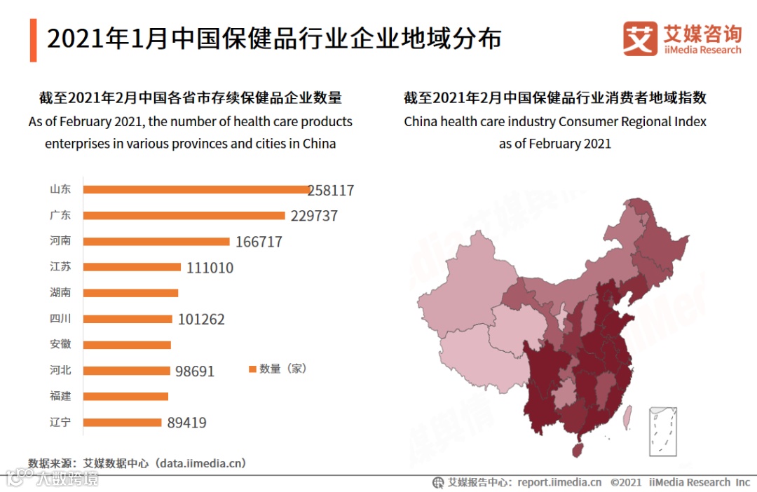 据统计,截至2021年2月,中国存续保健品企业总数为220多万家,其中山东、广东两个个省份保健品企业较多,均超过20万家。中国保健品企业集聚的地域与保健品消费用户分布基本一致,多集中在东部沿海地区,以及中部新一线城市所在省份。
