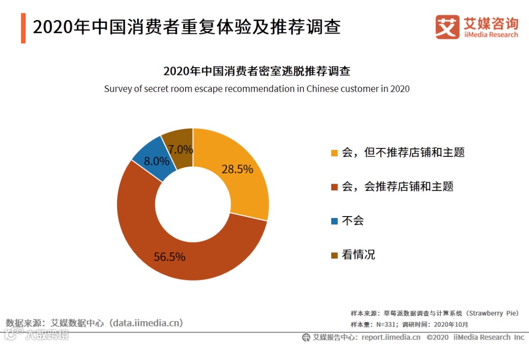 数据显示,超过80%的消费者表示会推荐密室逃脱给身边的人,其中28.5%表示只推荐密室逃脱游戏,但不推荐密室商家和主题,而56.5%表示会推荐具体的密室逃脱店铺和密室主题。艾媒咨询分析师认为,消费者在对于游戏体验好的密室逃脱店会有更强的重复消费和推荐意愿,因此树立良好的口碑对于密室逃脱商家来说有重要的意义。