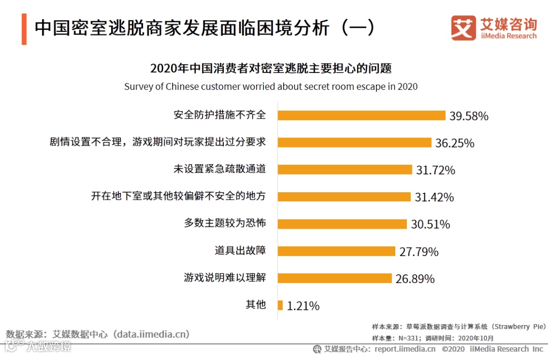 对于目前中国的密室逃脱行业,消费者最担心的问题主要是安全防护措施不齐全、未设置紧急疏散通道、开设地点不合规范等安全问题,其次是对于剧情难度无法适应的担忧。艾媒咨询分析师认为,密室逃脱行业已经进入规模化发展时期,复杂的机械系统设计和人群聚集都会给密室逃脱的安全带来威胁,需要出台相关的行业规范守则来规范密室的建造要求,提升安全等级,以免发生意外情况。