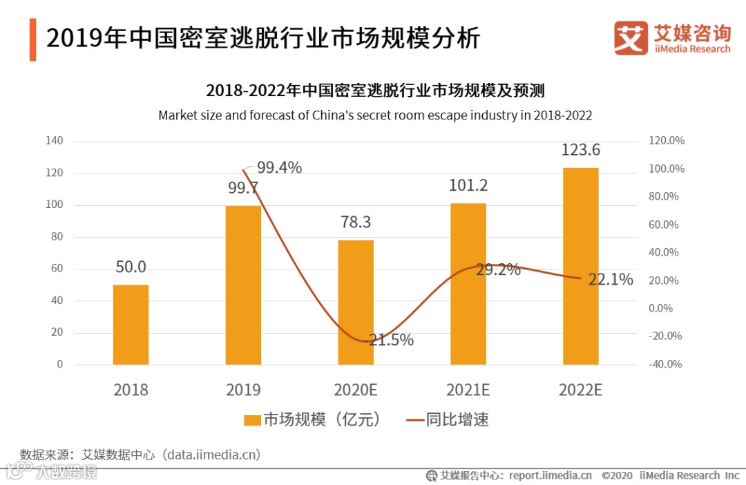 艾媒咨询分析师认为,作为舶来品,密室逃脱在国内已经走过12年,正朝着规模化方向发展。到2019年,中国密室逃脱行业市场规模突破100亿元,行业消费人次达到280万人次,门店个数超过10000家,行业发展较快;受疫情影响下密室逃脱的市场规模将会同比下降21.5%,但长期发展趋势向好。