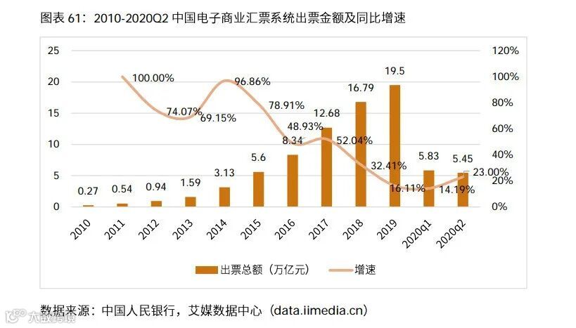 图表62:2010-2020Q2中国电子商业汇票系统出票金额及同比增速
