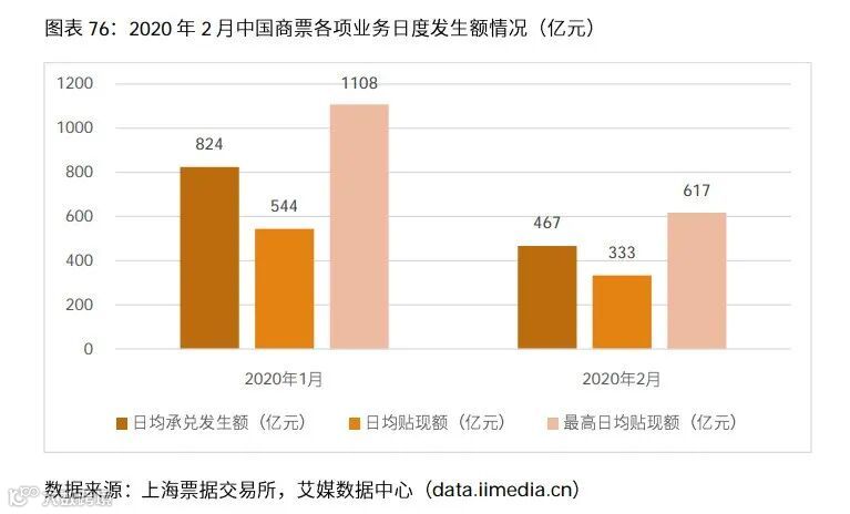 数据显示,截至2020年2月27日,2月中国商票日均承兑发生额(剔除春节假期)是467亿元,日均贴现额(剔除春节假期)333亿元,最高日贴现额是617亿元;而今年1月的日均承兑发生额是824亿元,日均贴现额是544亿元,最高日贴现额达1108亿元。艾媒咨询分析师认为,受疫情爆发和开工率较低的影响,商票业务量大幅下降。但随着疫情防控工作持续推进和非疫情防控重点地区有序复工复产,商票业务也逐渐恢复至上年日常水平。