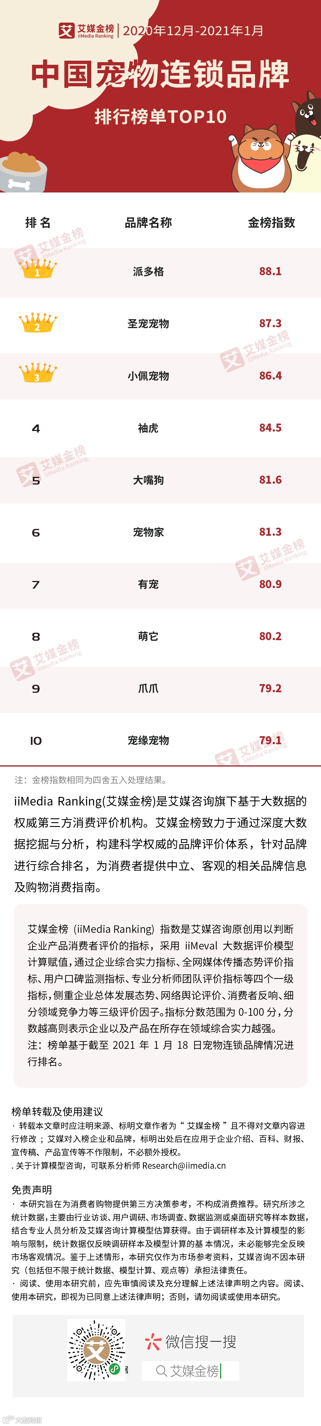 iiMedia Ranking艾媒金榜最新发布了《2020年12月-2021年1月中国宠物连锁品牌排行榜单TOP10》,此榜单采用iiMeval大数据评价模型计算赋值,通过企业综合实力指标、全网媒体传播态势评价指标、用户口碑监测指标、专业分析师团队评价指标等综合评选而出。此榜单榜单基于截至2021年1月18日宠物连锁品牌情况进行排名。