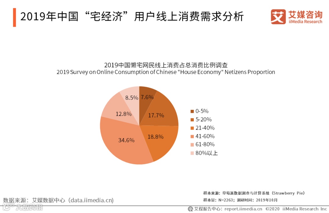 iiMedia Research(艾媒咨询)数据显示,2019年,21.3%宅家网民线上消费占总消费的比例在61%以上,宅家网民对线上消费依赖程度较高;77.1%宅家网民主要通过线上渠道进行娱乐,其中最受欢迎的是影视音乐,占比48.2%。