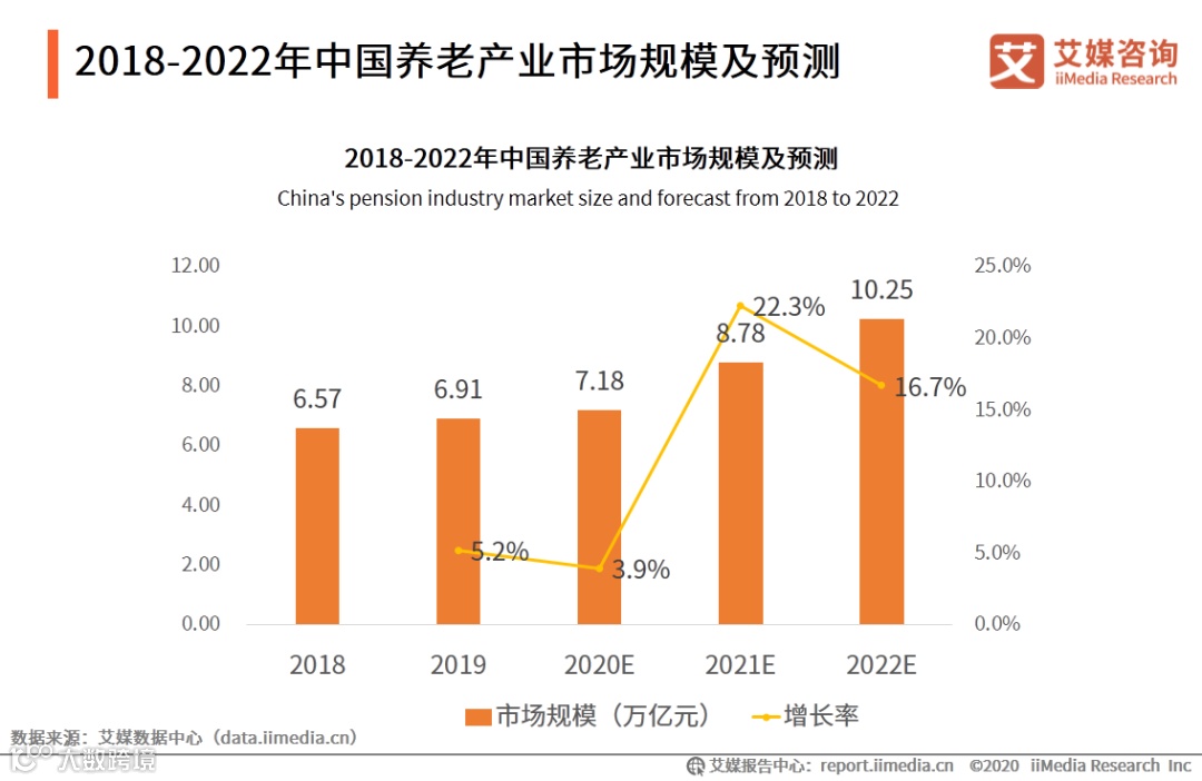 iiMedia Research(艾媒咨询)数据显示, 2019年中国养老产业市场规模达6.91万亿元。艾媒咨询分析师认为,在多方需求的驱动下,中国养老产业市场规模将会保持相对稳定的增长态势,到2022年预计突破10万亿元。