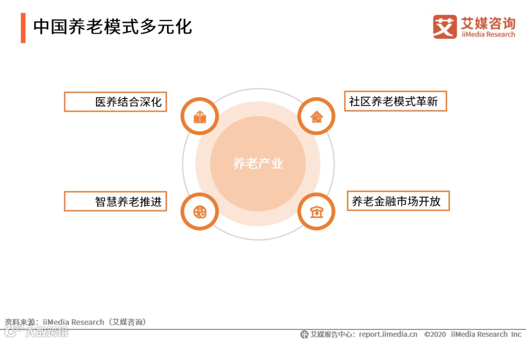 随着人口老龄化的加剧,国家越来越重视养老产业的发展,发布了一系列政策扶持。结合当下养老产业发展状况和养老产业政策热点,艾媒咨询分析师认为,中国政府支持社区养老模式革新、医养结合深化、智慧养老推进和养老金融市场放开等多个方向改革与开发,推动了养老产业发展。