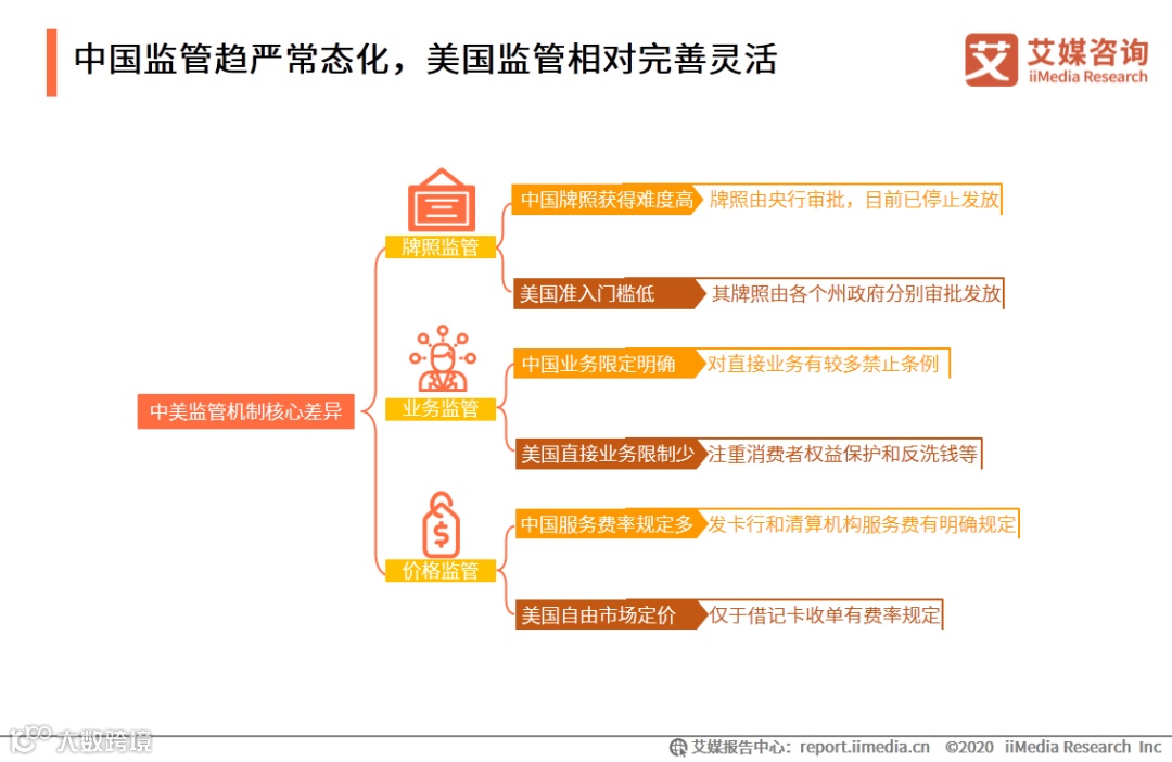 中美第三方支付监管机制在牌照监管、业务监管、价格监管三个核心监管层面呈现出明显差异。美国对于第三方支付机构的监管部分依靠于过往对传统金融机构的监管条例。而中国不断出台新的对应条例完善监管机制,对第三方支付行业监管趋严常态化。