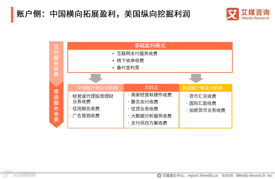 账户侧支付机构面向客户群体多元、涉及市场广泛,支付业务仅是账户侧支付机构盈利来源的起点。但因为中国远低于美国的线上线下收单服务费率和服务于电商行业的初衷,中国的互联网机构往往更倾向于以支付业务为流量诱饵,以不同场景的增值服务作为横向拓展收入的主要方式,包括信用报告提供、投资理财和广告营销等。美国互联网支付机构因为较宽松的监管机制和较高的收单服务费率,更倾向于以支付业务为基础纵向深入,依托支付业务挖掘增值服务利润,如货币汇兑、国际汇款、加密货币交易等。