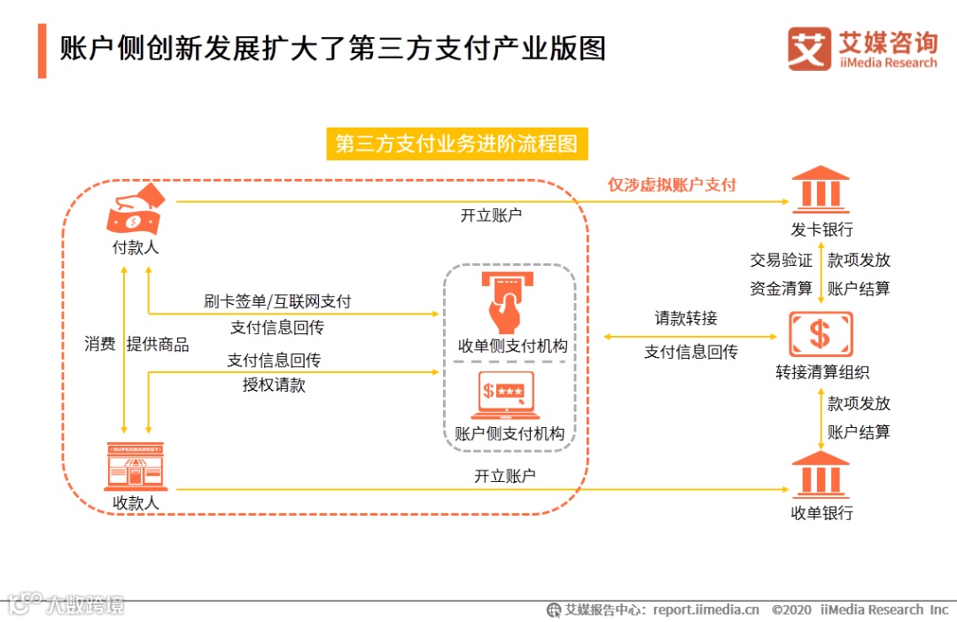 互联网技术以及电子商务的发展,催生了大量网络支付需求,账户侧支付服务机构随之产生,进一步壮大了第三方支付行业。账户侧支付机构不仅承担了银行收单服务商角色,少数账户侧支付机构还借助虚拟账户(电子钱包)承担了银行的角色。