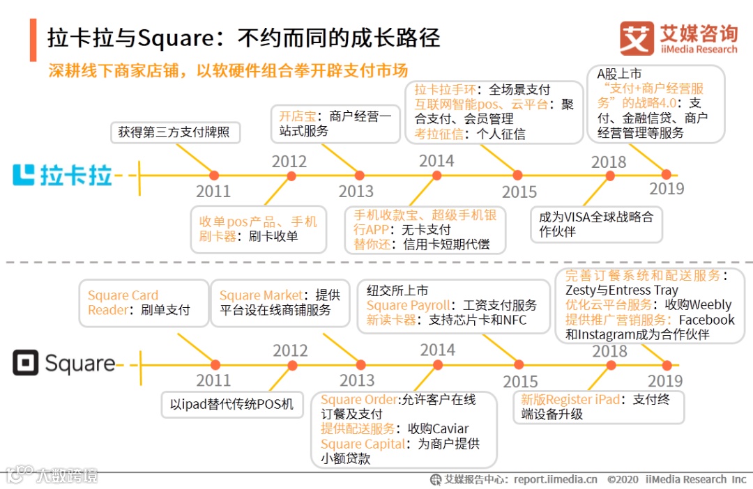 Paypal与支付宝,Square与拉卡拉,这两组企业在产品、业务、战略等维度都具有极高的相似性和可比性,但在发展进程和竞争力方面略有差异。