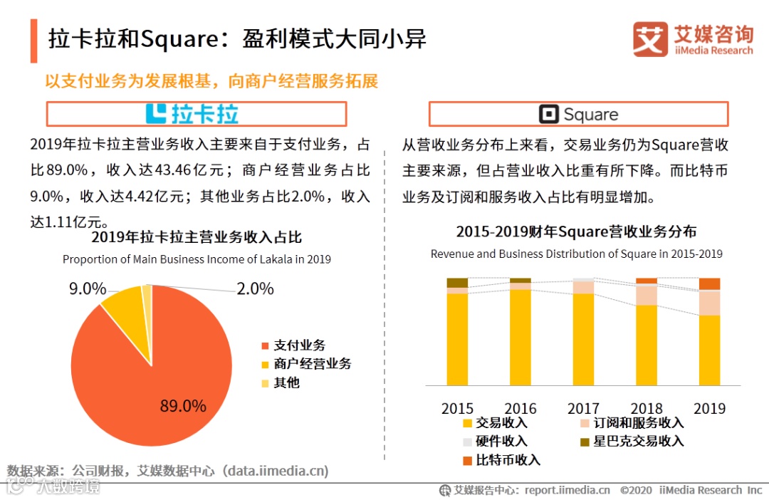 区别于Paypal和支付宝线上场景切入的策略, Square和拉卡拉选择从线下场景突围。在为商家提供综合支付解决方案方面,Square率先进行了探索,并验证了为商家赋能模式的可行性。拉卡拉业务模式的转换相对较晚,但凭借中国庞大的经济体量和提速的数字化进程,拉卡拉有望后发先至。