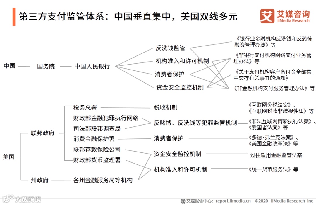 1. 第三方支付监管体系:中国垂直集中,美国双线多元