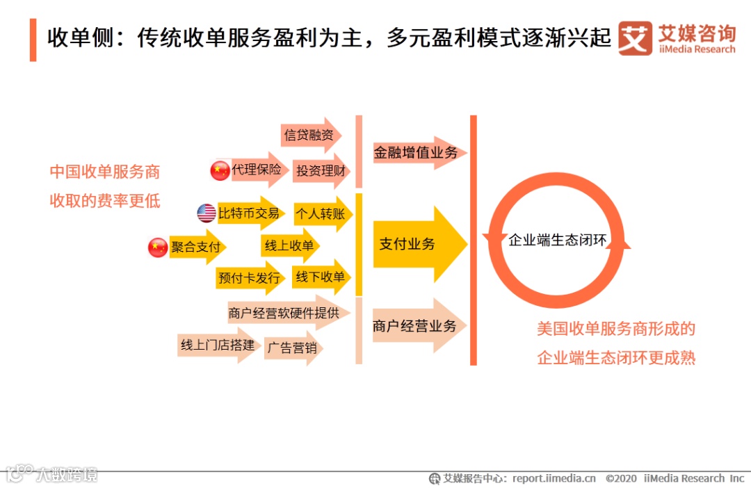 中美收单侧支付机构主要盈利模式是面向企业端收取收单手续费。近年来,两国的部分收单侧支付机构开始依靠支付业务积累的商户资源为商户经营提供软硬件支持、广告营销及融资服务等,并涉足消费者端的支付业务,逐渐发展为全渠道支付业务,盈利模式展现出面向商户为主的多元化趋势。