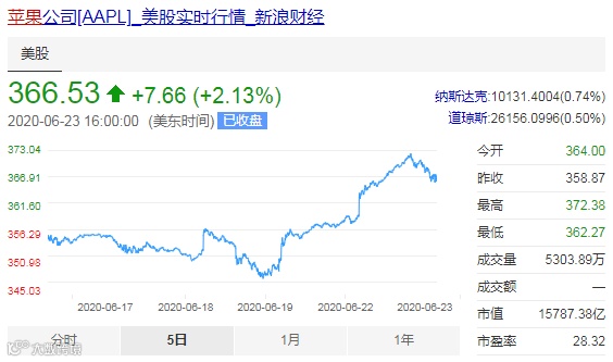 随着苹果开发者大会的召开,苹果股价也再创历史新高。截至美国当地时间6月22日收盘,苹果股价收报358.87美元,涨幅达2.62%,总市值高达1.56万亿美元。23日苹果股价续刷历史新高,收涨2.13%,总市值升至1.58亿美元。