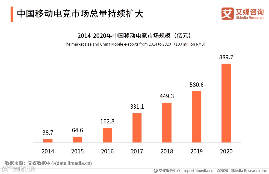 2020年虽然受到“新冠疫情”影响,但得益于数字娱乐发展,电子竞技行业整体市场实现逆势上扬。iiMedia Research(艾媒咨询)数据显示,中国移动电竞市场规模持续扩大,2015年起进入高速发展期,2020年市场规模更达到889.7亿元。同时,中国移动电竞用户规模也进一步扩大,2020年达3.83亿人。