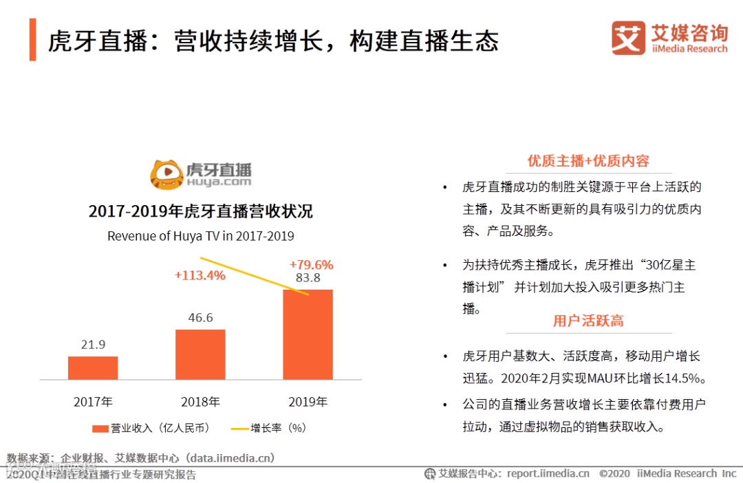 自2014年11月成立以来,虎牙直播一直采取精品化内容战略、深耕游戏领域。通过与热门主播合作、创造优质内容,虎牙直播成长为国内用户活跃度领跑全行业的游戏直播平台。2019年虎牙直播实现营收83.8亿人民币,同比增长近80%。