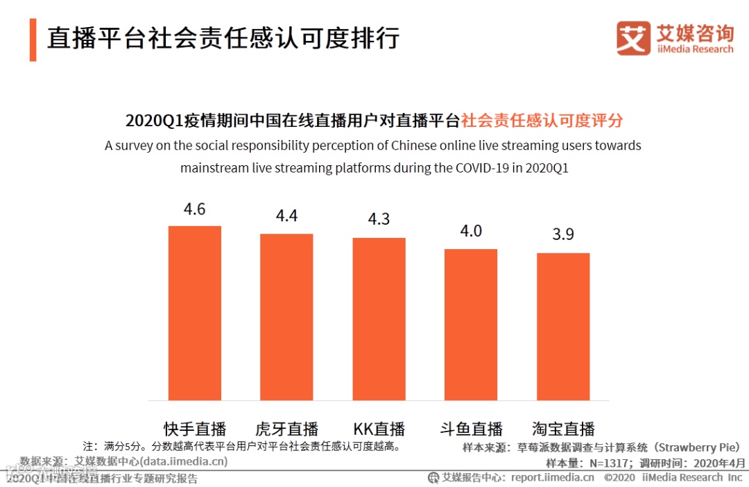 iiMedia Research(艾媒咨询)调研数据显示,快手直播用户对平台社会责任感认可度最高,虎牙直播、KK直播排名二三位。艾媒咨询分析师认为,落实社会责任感的公益活动包括平台开展抗疫公益活动、鼓励主播推广公益项目、以及普通主播培养计划等,旨在传递正能量文化、提高企业品牌形象。