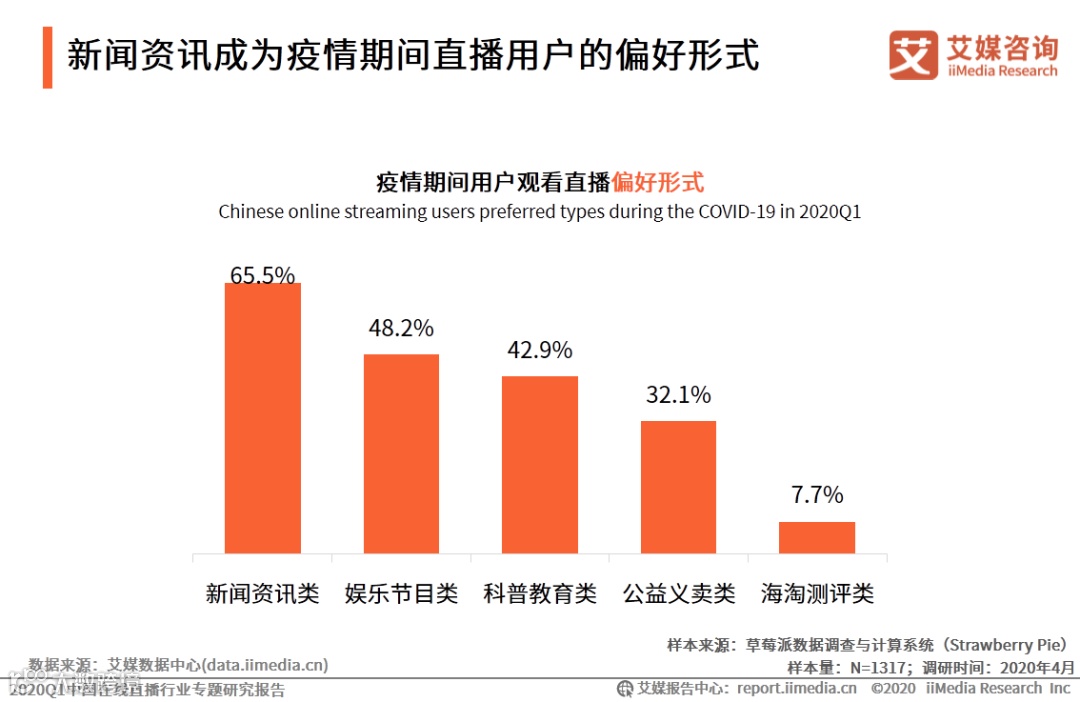 iiMedia Research(艾媒咨询)调研数据显示,疫情期间,超六成直播用户偏好新闻资讯类直播。相较于传统媒体,直播平台上的自媒体用户具备资讯更新的时效性,可视化的直播形式也助于内容的传播与理解,从而提高新闻动态传播的速度与广度。