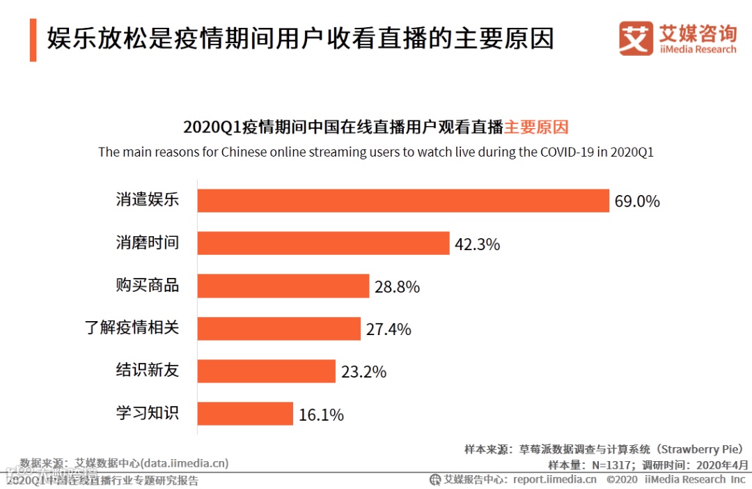 iiMedia Research(艾媒咨询)调研数据显示,疫情期间,消遣娱乐及消磨时间是疫情期间用户观看直播的主要原因。同时了解与疫情相关的新闻动态也是用户收看直播的动机之一,实时性、可视化的特点使更多用户倾向于以直播形式了解资讯。