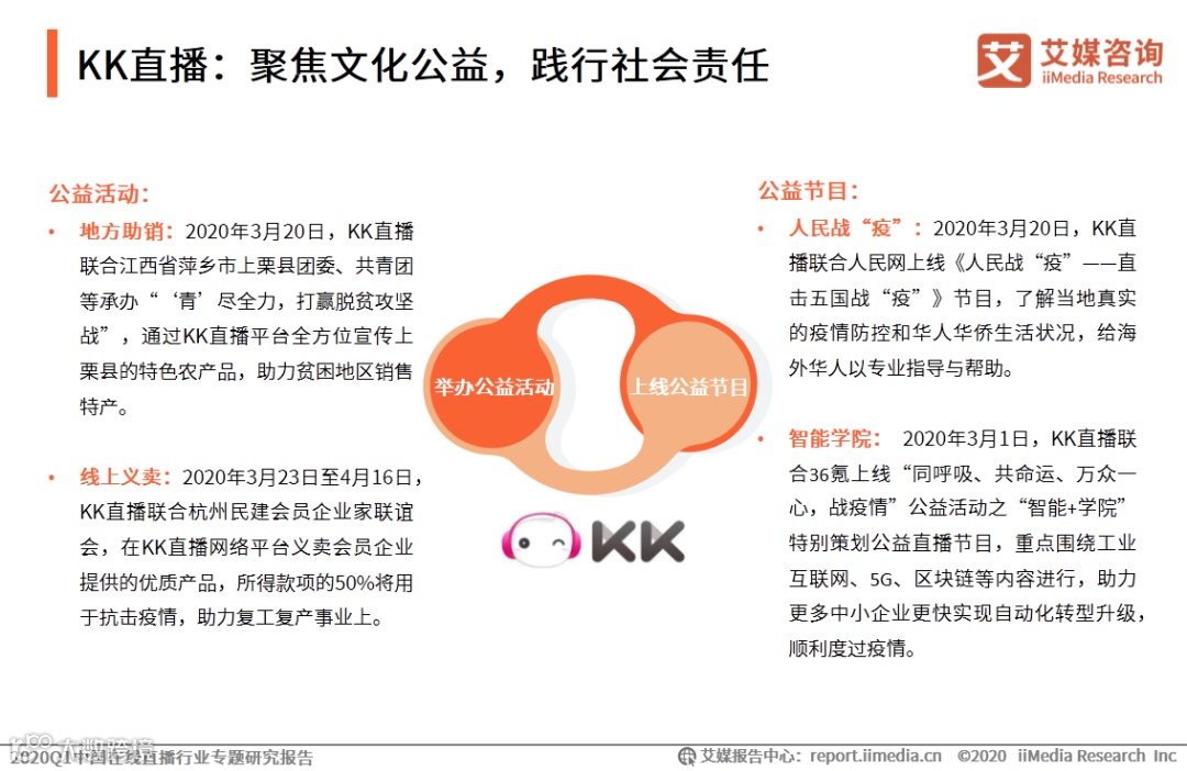 KK直播近年来在“直播+”领域表现突出,大力推出各类文化教育节目,打造优质文娱内容;同时聚焦公益,丰富直播内容的同时逐步完成品牌形象升级,践行企业社会责任。疫情期间,KK直播通过公益活动、公益节目等方式,在帮助复工复产、恢复地方经济、爱心科普多方面积极抗”疫“,传递正能量。