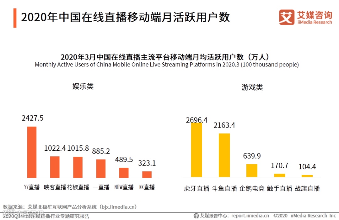 iiMedia Research(艾媒咨询)数据显示,2020年3月,YY直播以2427.5万人的月均活跃用户数排在娱乐类直播平台首位。游戏类直播平台中,虎牙直播、斗鱼直播月均活跃用户数领先,月活分别为2696.4万人及2163.4万人。