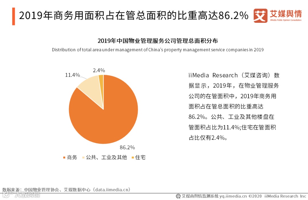 iiMedia Research(艾媒咨询)数据显示,2019年,在物业管理服务公司的在管面积中,2019年商务用面积占在管总面积的比重高达86.2%。公共、工业及其他楼盘在管面积占比为11.4%;住宅在管面积占比仅有2.4%。