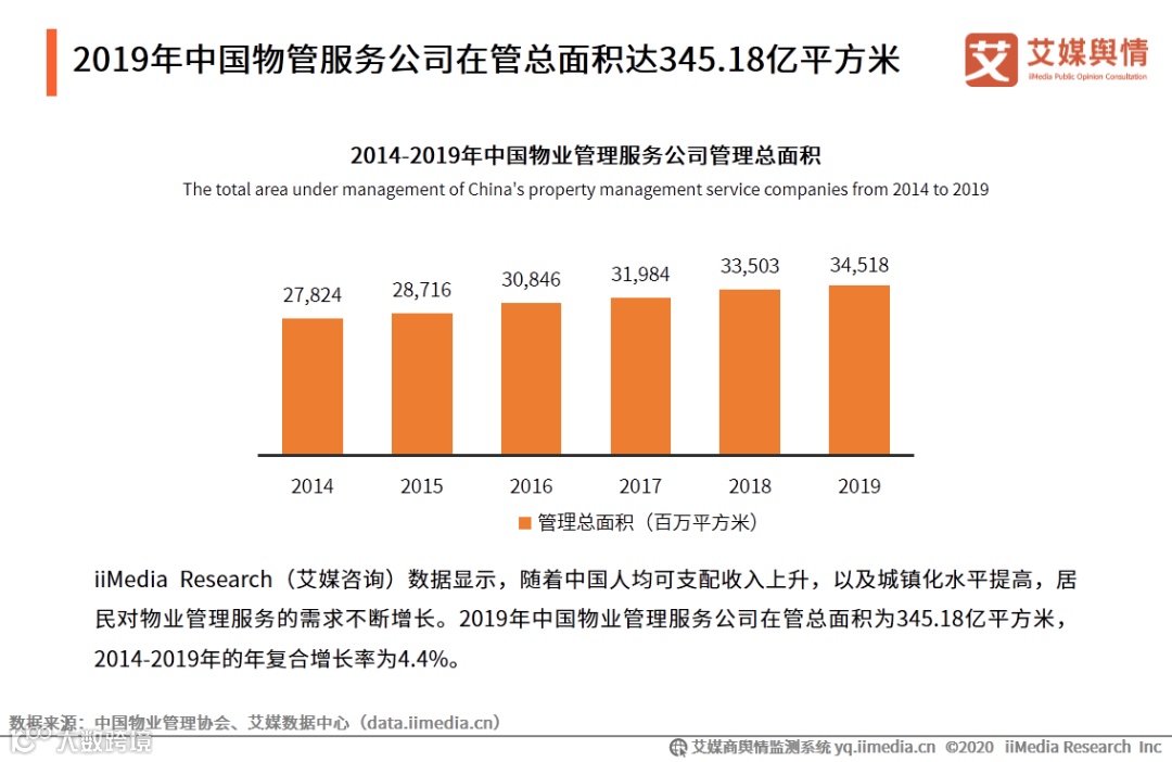 iiMedia Research(艾媒咨询)数据显示,随着中国人均可支配收入上升,以及城镇化水平提高,居民对物业管理服务的需求不断增长。2019年中国物业管理服务公司在管总面积为345.18亿平方米,2014-2019年的年复合增长率为4.4%。