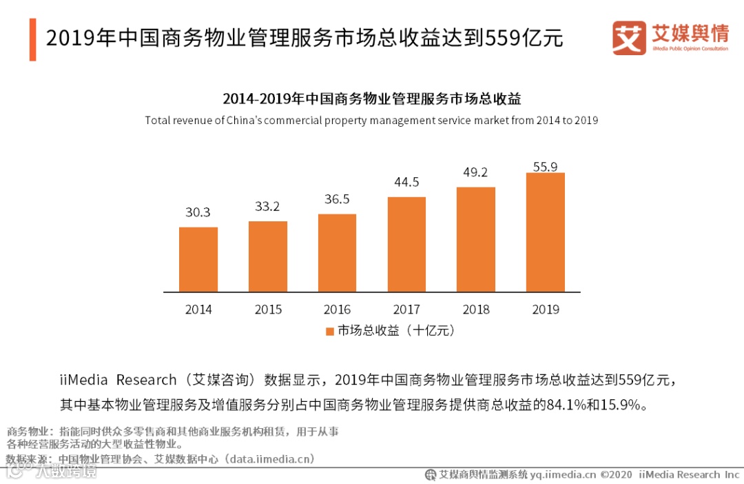 iiMedia Research(艾媒咨询)数据显示,2019年中国商务物业管理服务市场总收益达到559亿元,其中基本物业管理服务及增值服务分别占中国商务物业管理服务提供商总收益的84.1%和15.9%。