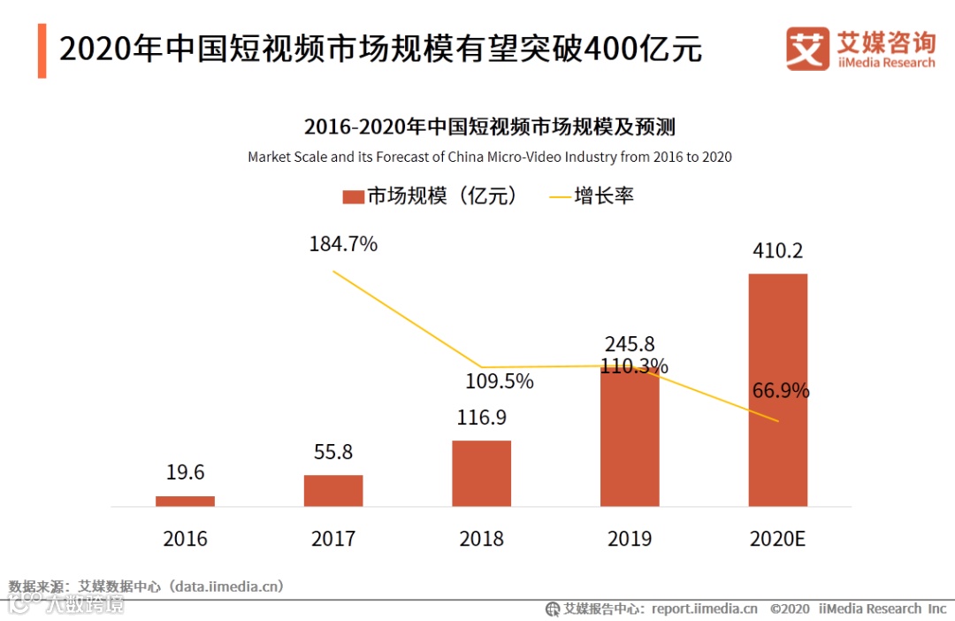 iiMedia Research(艾媒咨询)数据显示,中国短视频市场增长迅速,近年增长速度都在60%以上,2020年市场规模更有望达到410.2亿元。艾媒咨询分析师认为,短视频自身形式丰富、片段化、趣味化的特点,使其更适合新的营销趋势,加上直播电商在短视频领域的应用加深,其市场发展前景值得期待。