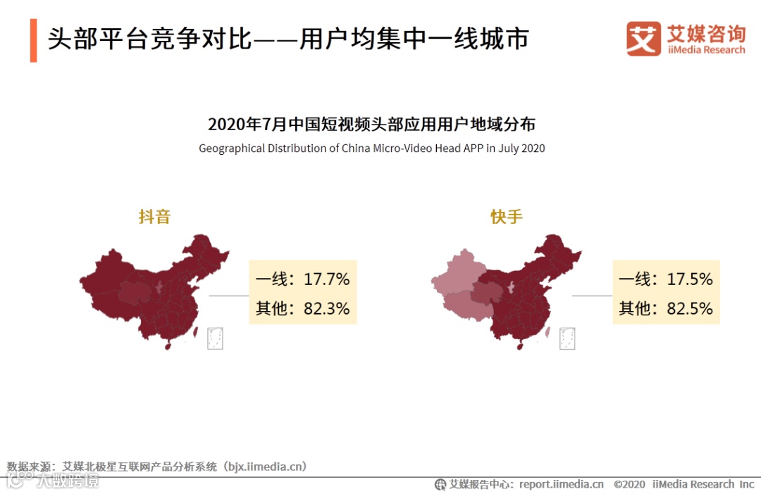 iiMedia Research(艾媒咨询)数据显示,地域分布方面,抖音及快手均以一线城市人群为主要用户,占比分别为17.7%和17.5%;但快手用户更集中于东部及中部地区,西部地区用户占比相对更少。艾媒咨询分析师认为,短视频兴起后在全国范围快速普及,但在一些偏远地区和下沉市场的开发仍有较大空间,相对而言抖音用户地域分布更加均衡。