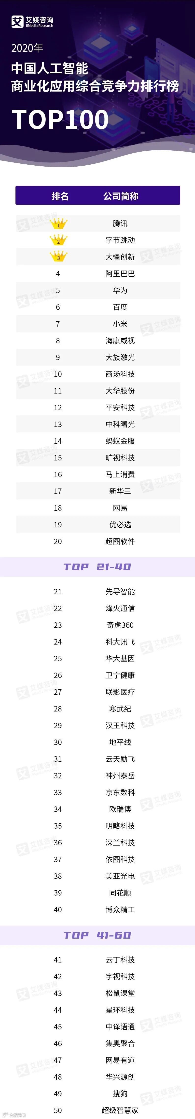 艾媒金榜最新发布了《2020中国人工智能商业化应用综合竞争力排行榜》,其中腾讯位列榜首,字节跳动、大疆创新、阿里巴巴、华为分列第二、第三、第四、第五。该榜单侧重于在人工智能企业的资本实力、经营状况和潜力、市场估值以及商业化落地能力上进行评比,由此对当前人工智能商业化应用综合竞争力进行排名。