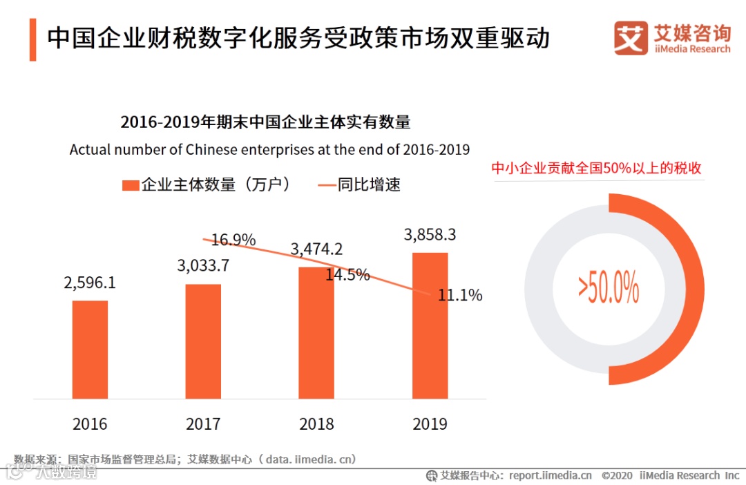 财税方面,2019年期末中国实有的企业主体数量为3858.3万户,同比增长11.1%。虽然企业数字化变革进程加速,但企业财税数字化程度并不高。财税数字化改革正在国家强力推行下快速落地,这将促使企业财税数字化服务需求激增,财税服务市场有望迎来快速增长。