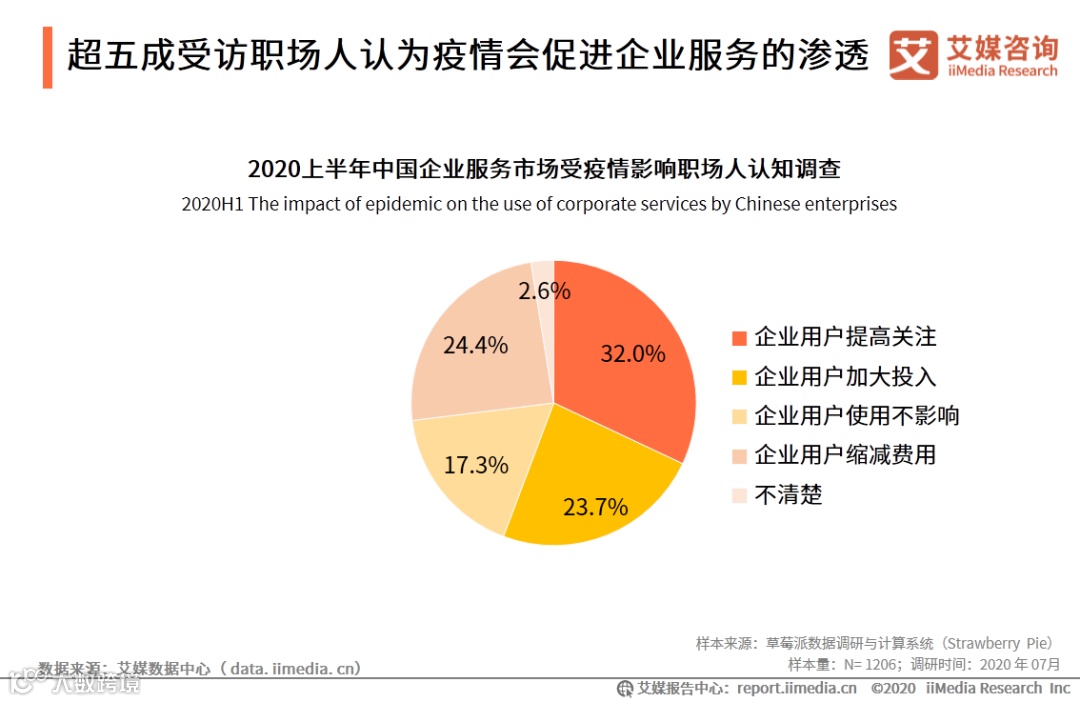在市场认知方面,艾媒咨询数据显示,32.0%的受访职场人认为受疫情影响企业会提高对企业服务市场的关注,23.7%的受访职场人认为企业会加大对相关服务的投入。