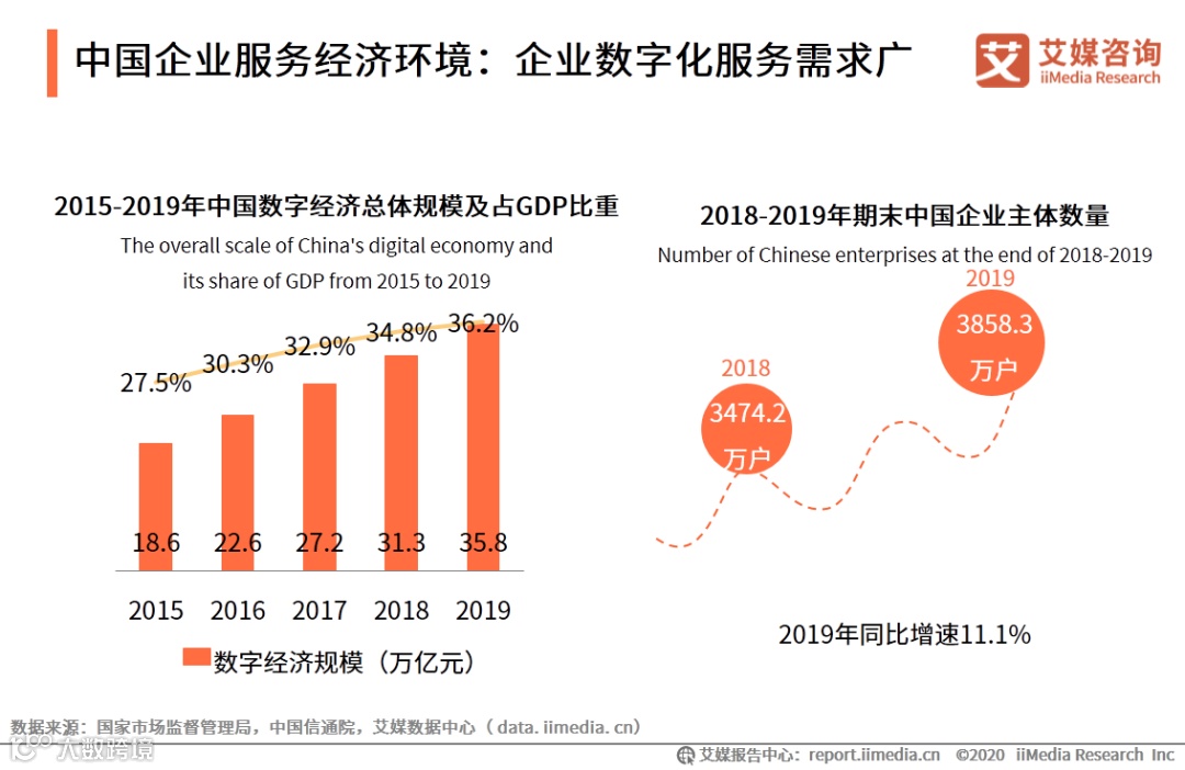 近年来,中国企业主体数量保持持续增长态势,至2019年期末,中国企业主体数量达3858.3万户,同比增速达11.1%。与此同时,数字经济发展不断深入, 2019年中国数字经济规模达35.8万亿元,占GDP比重为36.2%。中国中小企业数量庞大,整体数字化仍有大幅提升空间,企业数字化服务需求广。