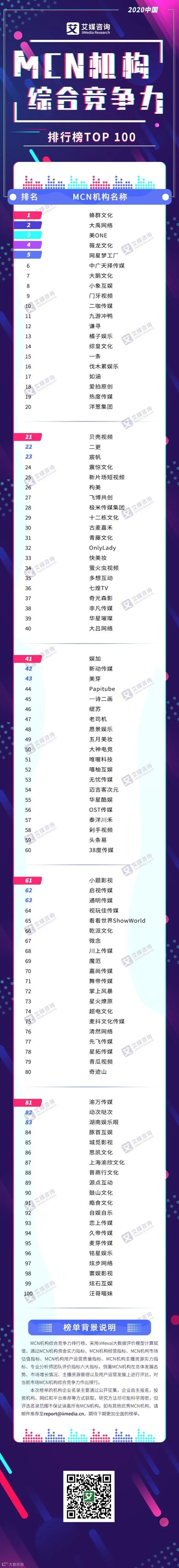 艾媒金榜最新发布了《2020中国MCN机构综合竞争力排行榜》,其中蜂群文化位列榜首,大禹网络、美ONE、薇龙文化、网星梦工厂分列第二、第三、第四、第五。该榜单侧重于在MCN机构的总体发展态势、市场增长情况、主播资源管理以及用户运营发展上进行评比,由此对当前市场MCN机构综合竞争力进行排名。