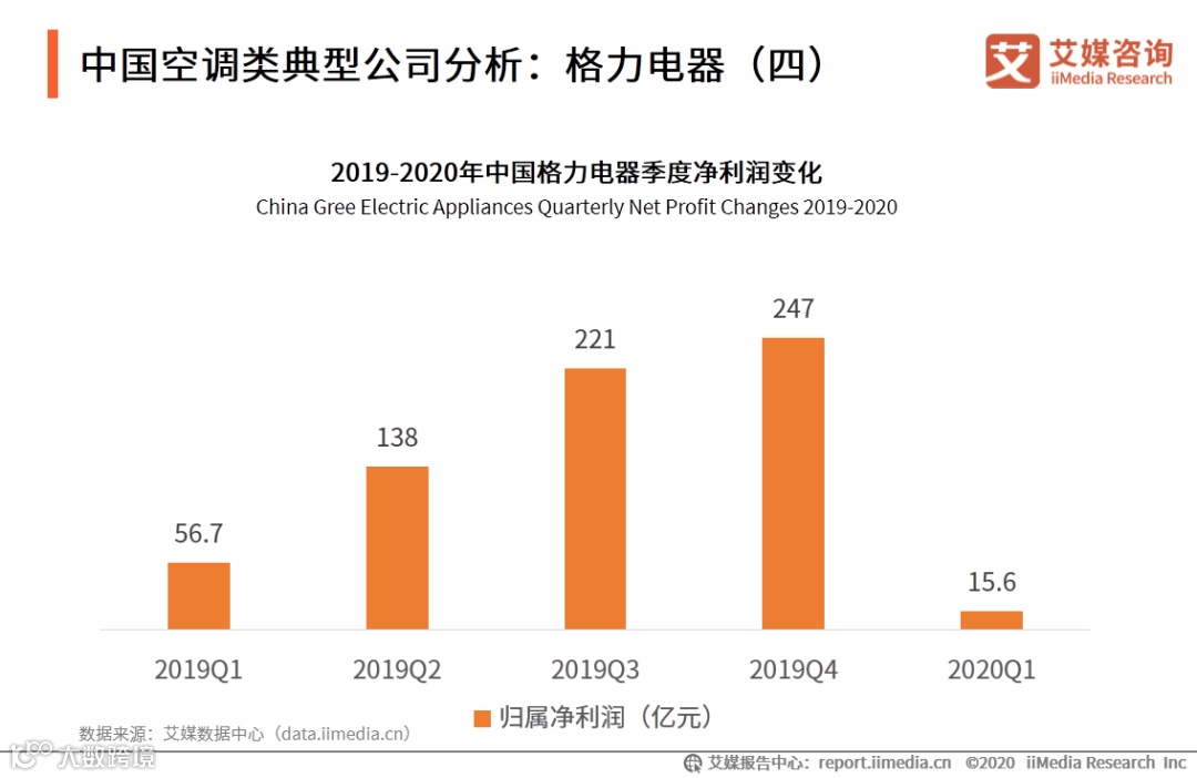 数据显示,格力电器披露2019年报和2020年1季报,其中2019年一季度归属净利润56.7亿元,2020年一季度归属净利润15.6亿元,同比下降72.5%。艾媒咨询分析师认为,由于疫情影响,格力集团2020年一季度利润急剧下降,但是而5-6月份,由于气温升高,人们对空调需求增加,格力集团净利润将有所上升。