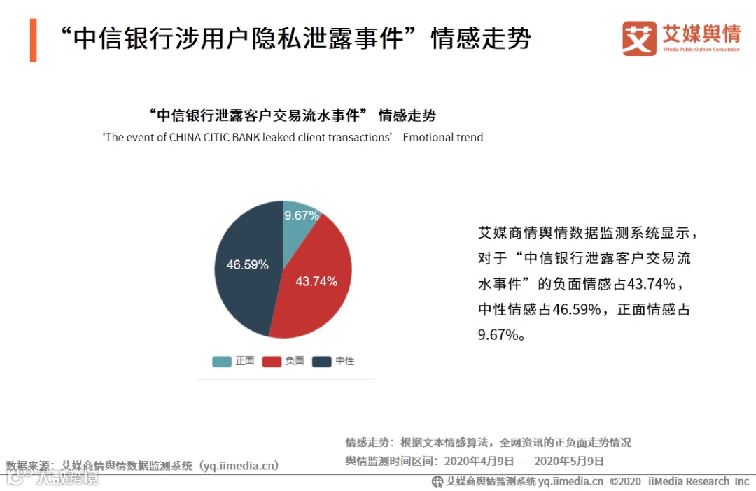 艾媒商情舆情数据监测系统显示,对于“中信银行泄露客户交易流水事件”的负面情感占43.74%,中性情感占46.59%,正面情感占9.67%。