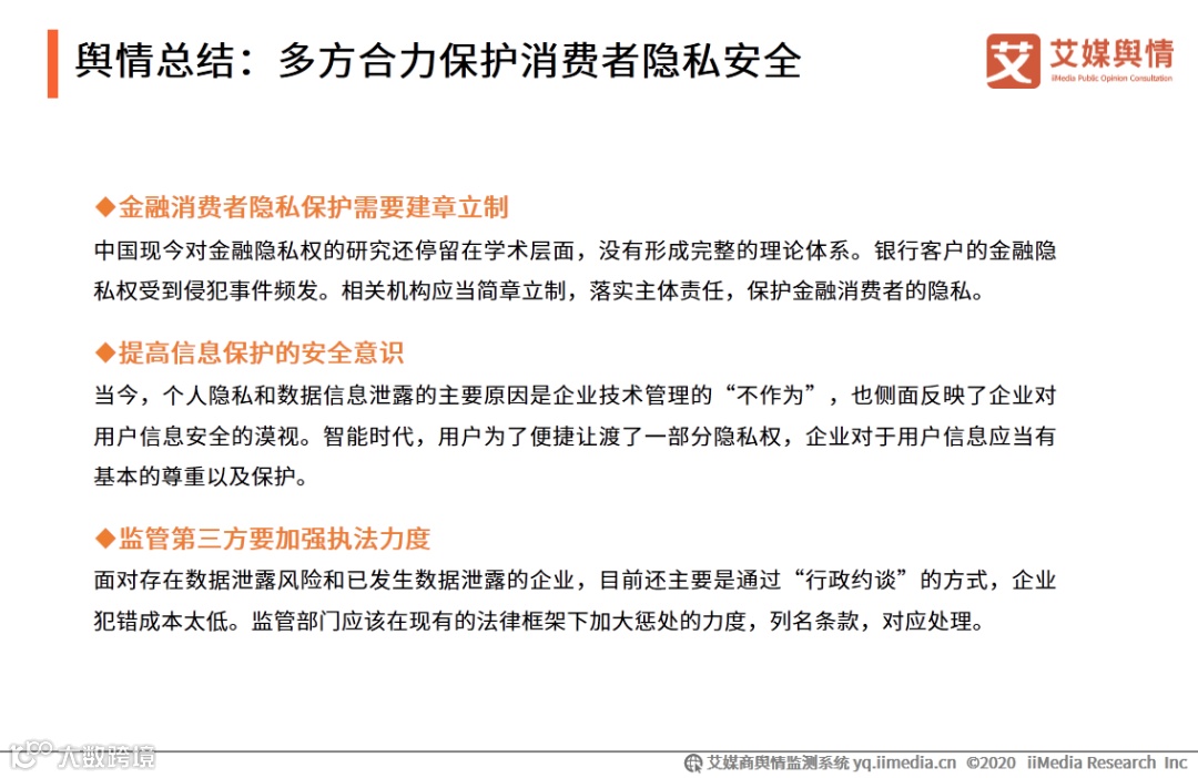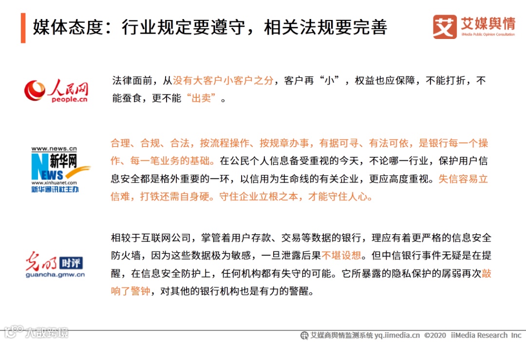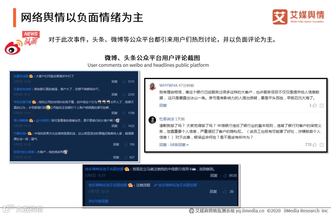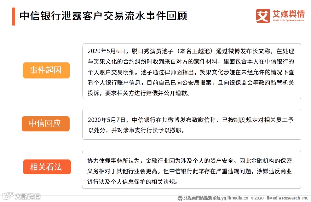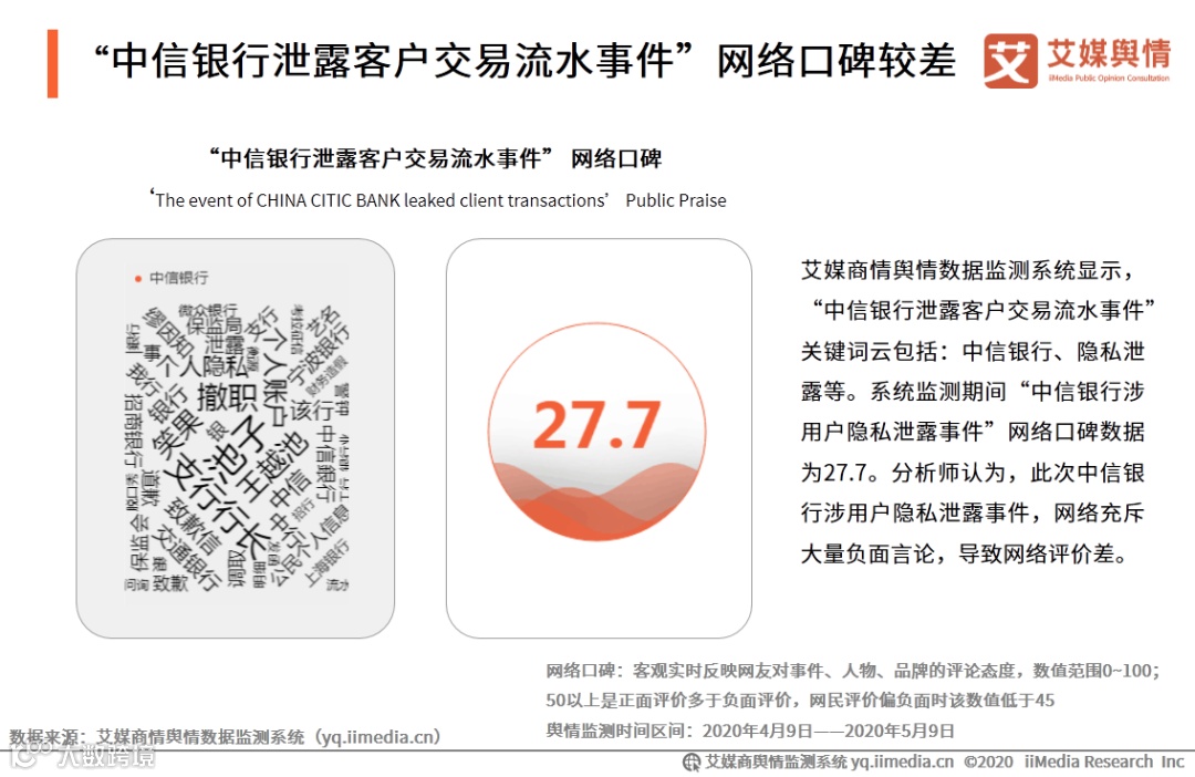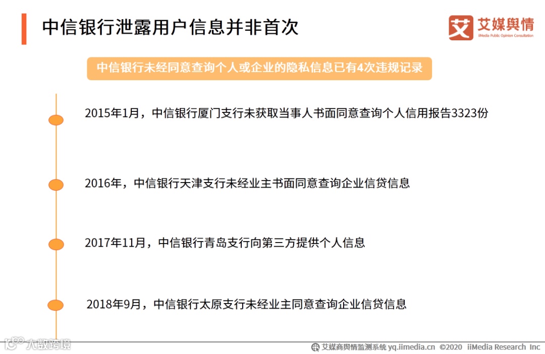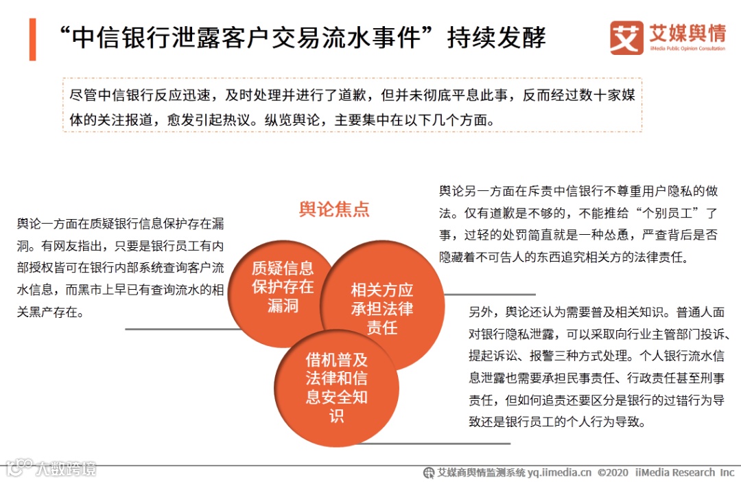 以上内容源自艾媒咨询发布《2020年中信银行泄露客户交易流水事件舆情监测报告》,完整版共23页。
