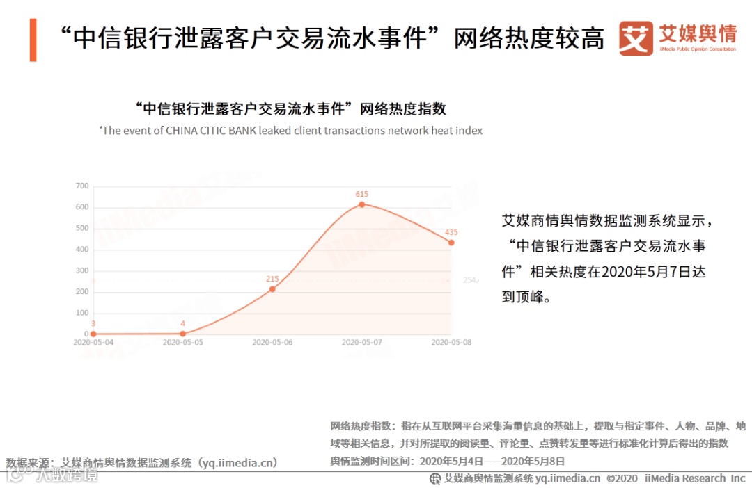 艾媒商情舆情数据监测系统显示, “中信银行泄露客户交易流水事件”相关热度在2020年5月7日达到顶峰。