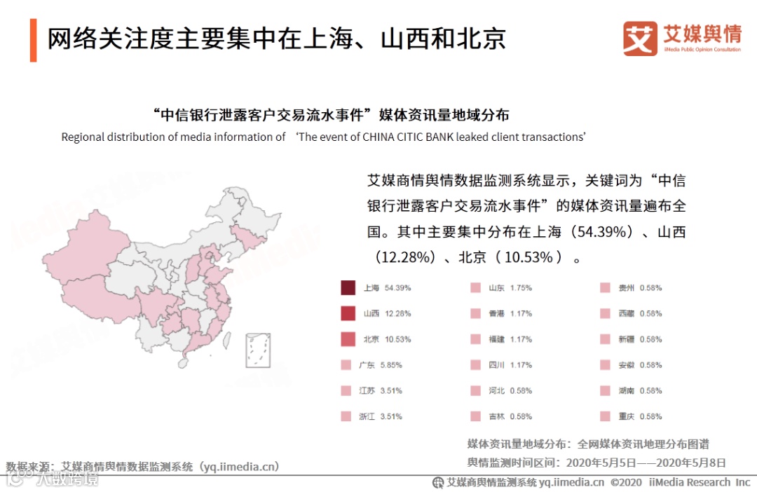 艾媒商情舆情数据监测系统显示,关键词为“中信银行泄露客户交易流水事件”的媒体资讯量遍布全国。其中主要集中分布在上海(54.39%)、山西(12.28%)、北京( 10.53% ) 。