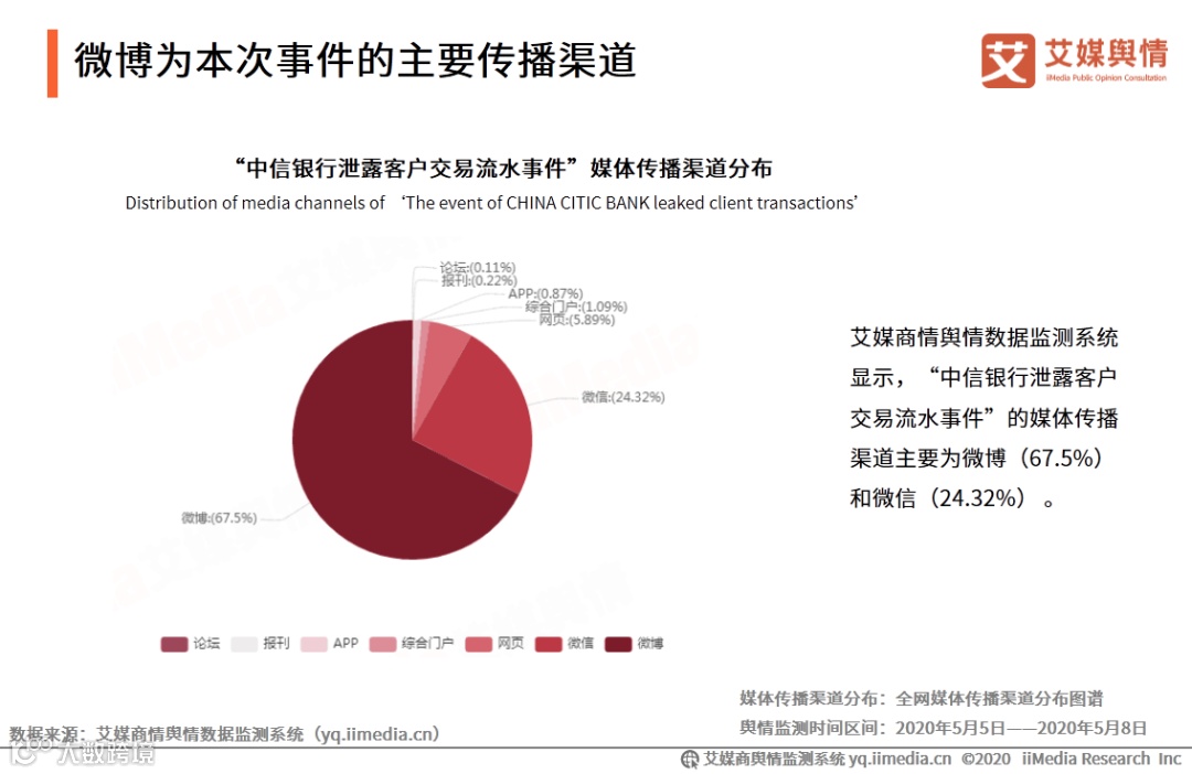 艾媒商情舆情数据监测系统显示,“中信银行泄露客户交易流水事件”的媒体传播渠道主要为微博(67.5%)和微信(24.32%) 。