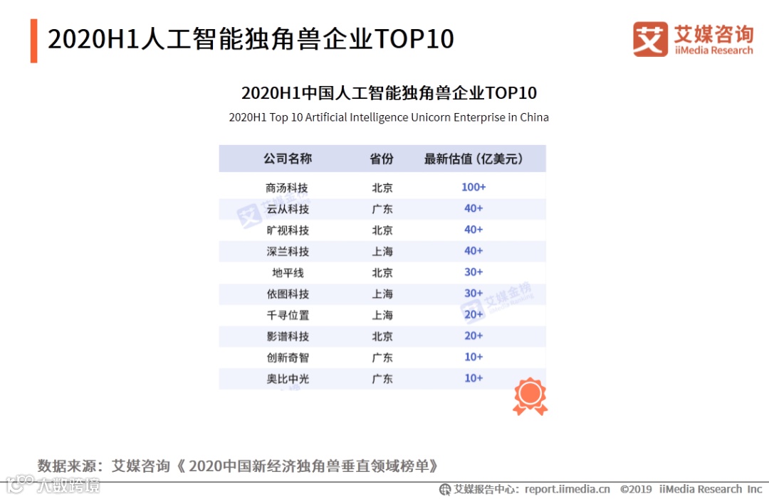 15. 2020H1人工智能独角兽企业TOP10
