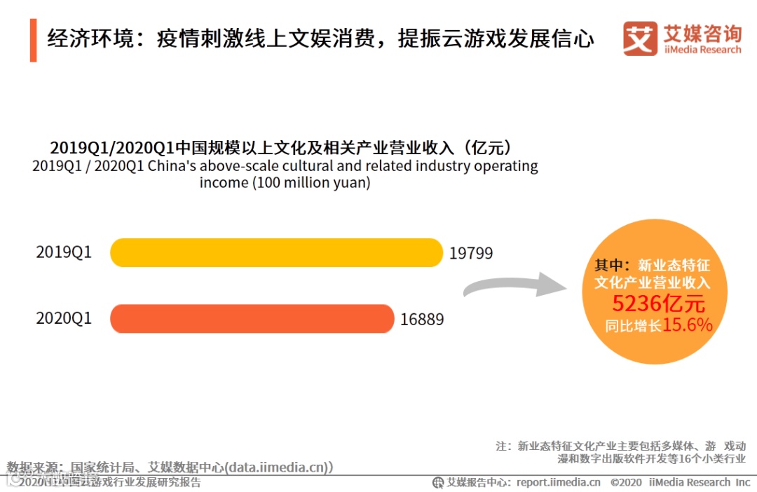 2020年第一季度,因疫情防控需要,全国范围内取消聚集性文化活动,导致文化相关产业营收整体骤减,但“互联网+文化”消费却呈现逆势上行。数据显示,2020Q1中国规模以上文化及相关产业营业收入为16889亿元,较上年同期明显下降,而一些具备互联网因素的文化新业态营业收入增速却达到了15.6%,反差明显。艾媒咨询分析师认为,“互联网+文化”消费的逆势增长反映出居民文化消费的刚需特征,疫情期间居民线上生活娱乐习惯的深化,有利于云游戏这类新业态文化产业快速发展。